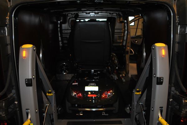 * Chariot pivotant construit sur-mesure et installé en rang 2 pour permettre le placement d’un des scooters perpendiculairement au sens de marche du véhicule – ACM Mobility Car